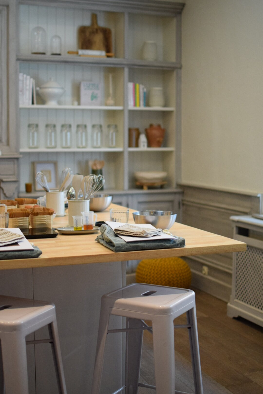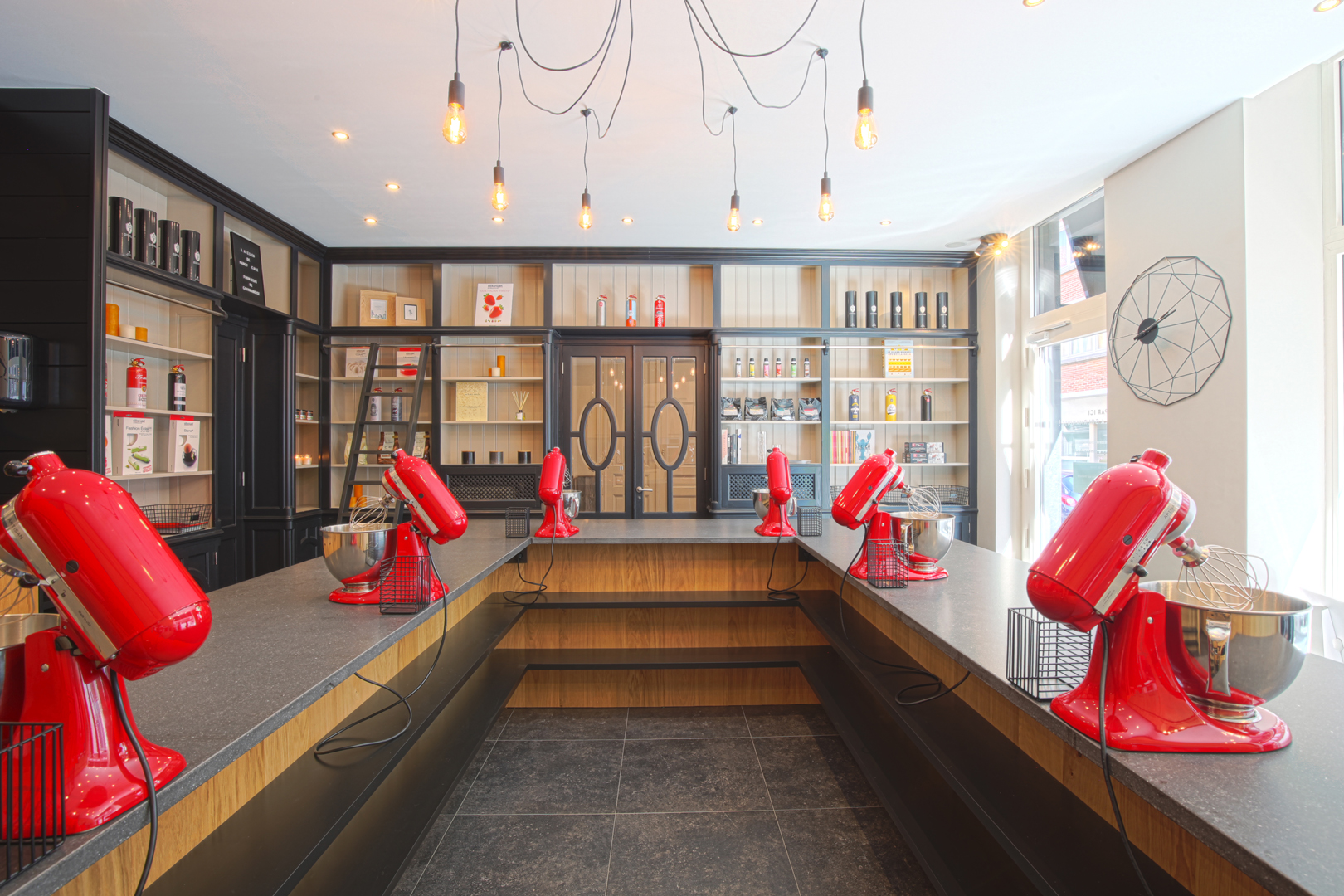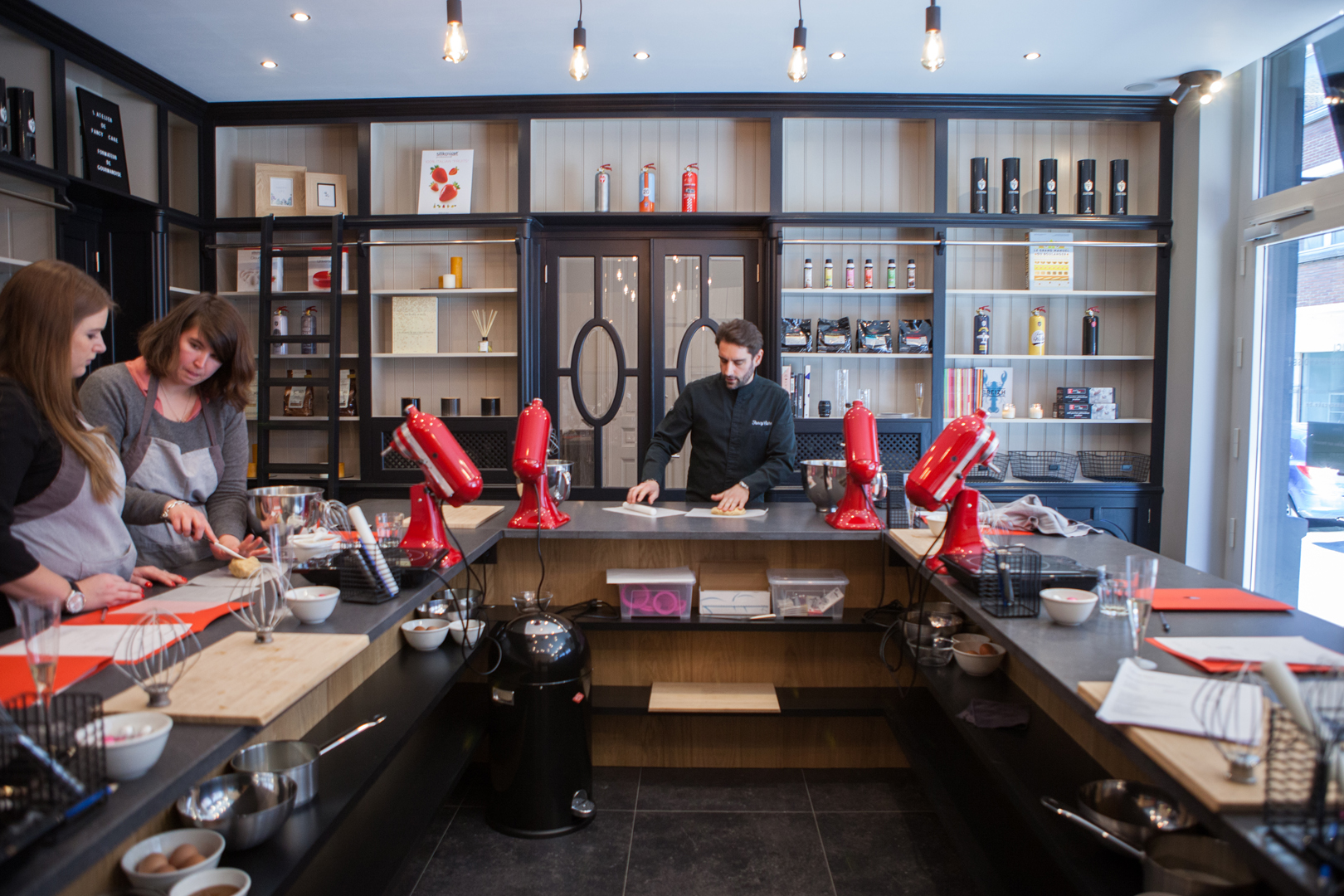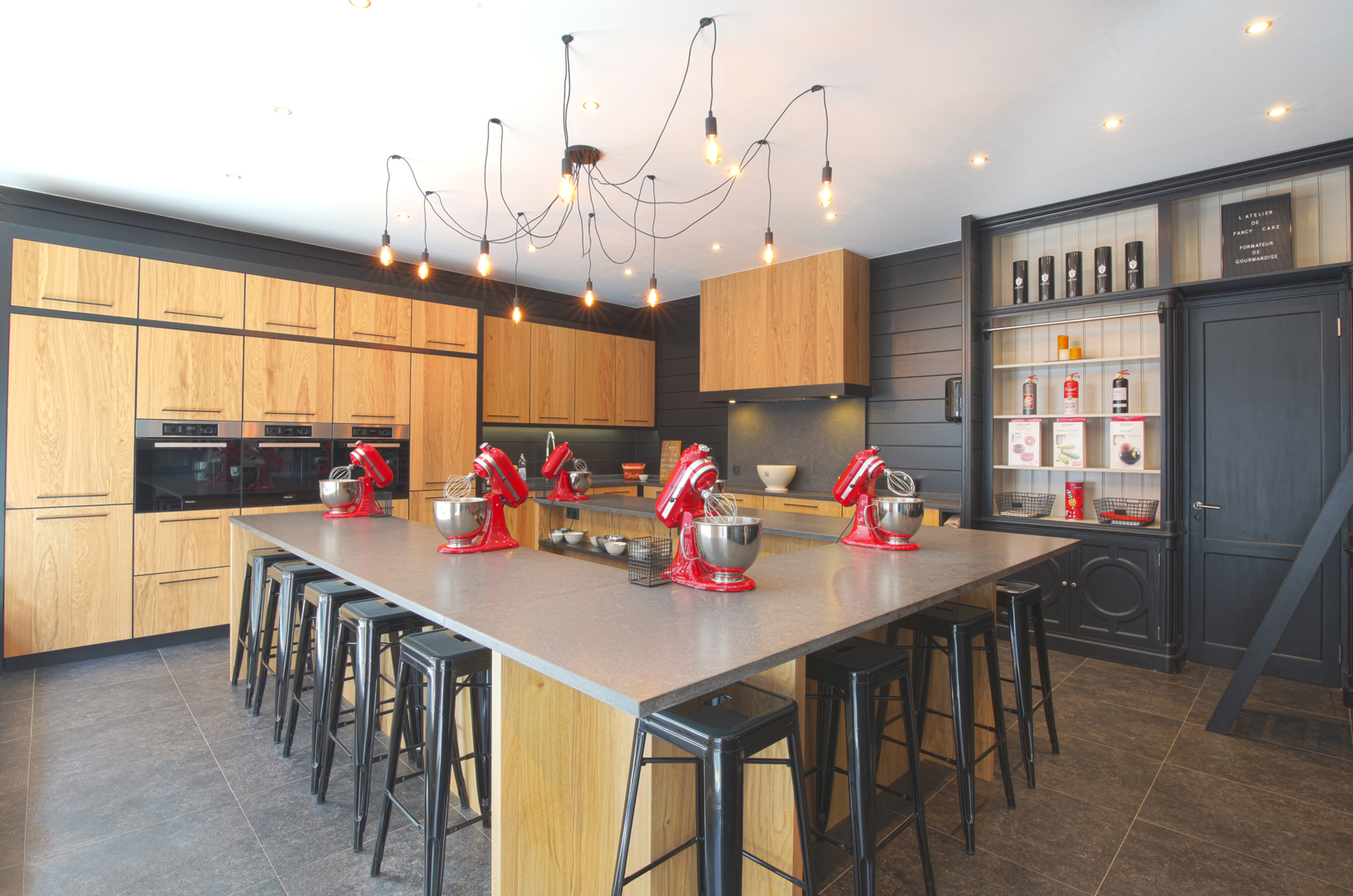 Notre atelier est composé d’un grand îlot au centre de la pièce. D’un long plan de travail sur le côté et de nombreux rangement. Celui-ci offre une proximité et une aisance grâce à sa forme en U pouvant accueillir jusqu’à 12 personnes assises . L’atelier est équipé de 2 fours, un micro-ondes, un réfrigérateur, un congélateur, 2 cellules de refroidissement, un lave vaisselle, 10 robots KitchenAid, 6 plaques à induction portatives, une hotte, batterie de cuisine, ustensiles en tout genre, vaisselle …